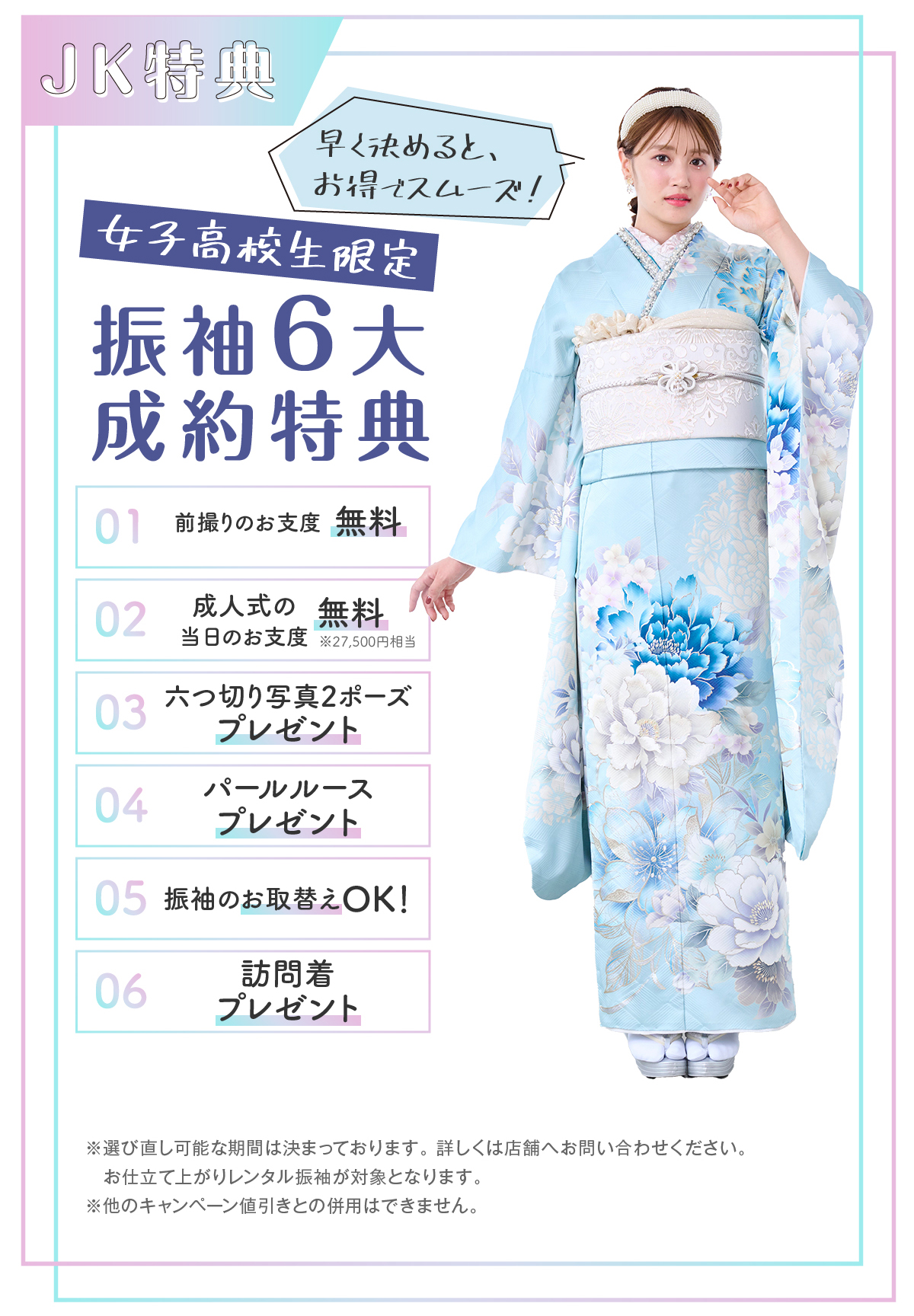 振袖を選ぶおすすめの時期は高校3年生の時です。特に人気のデザインやサイズは早くに予約が埋まることが多いです。さらに、式典当日のお支度時間は先着順のため、早めのご予約で、良いお時間を抑えることができます。