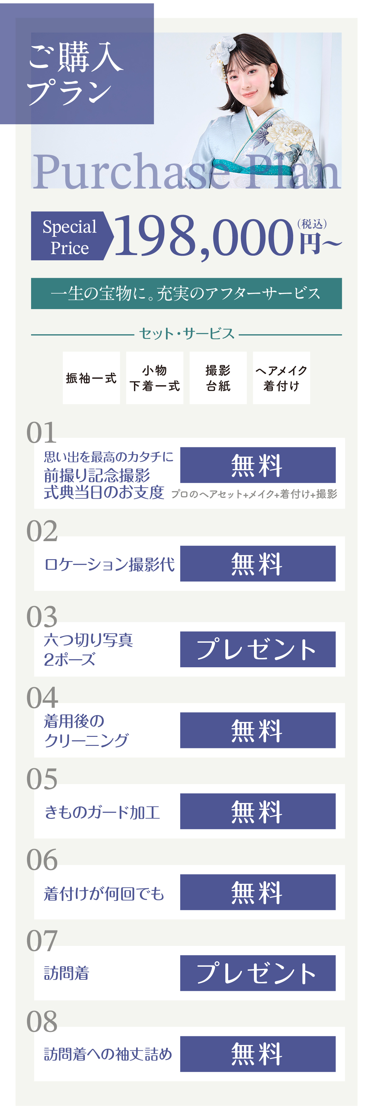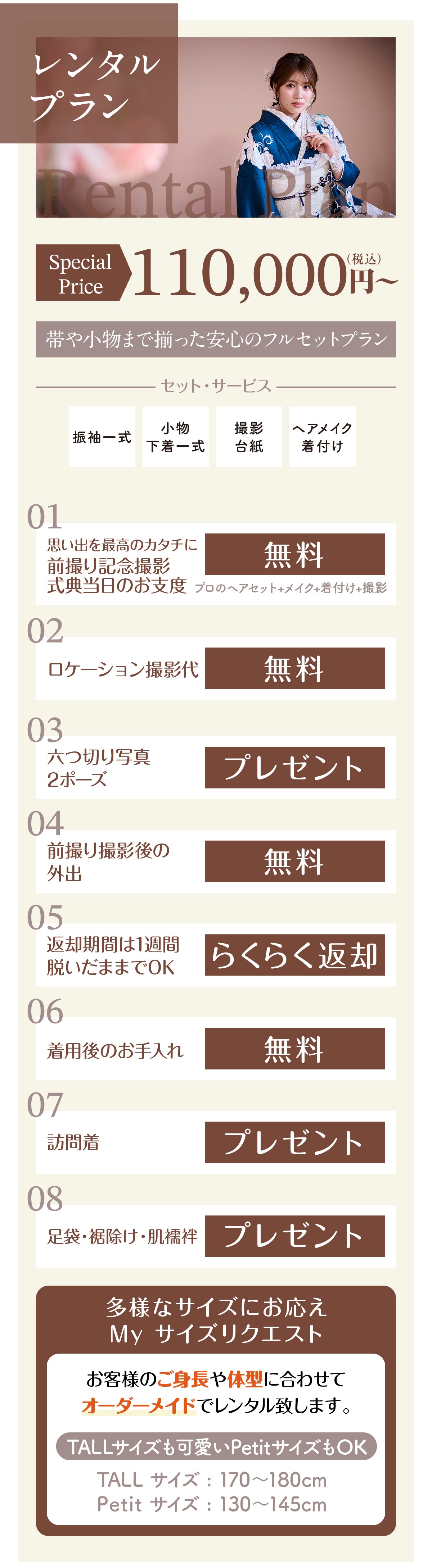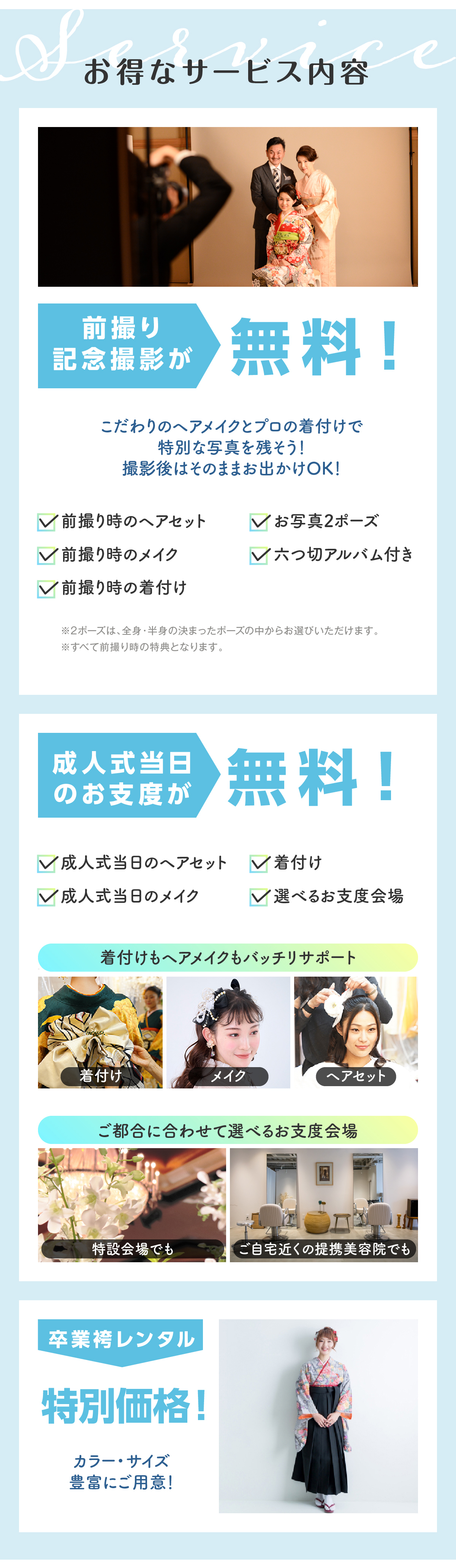 着付けやヘアメイクのサービスがあるか、アフターサービスが充実しているかなど。