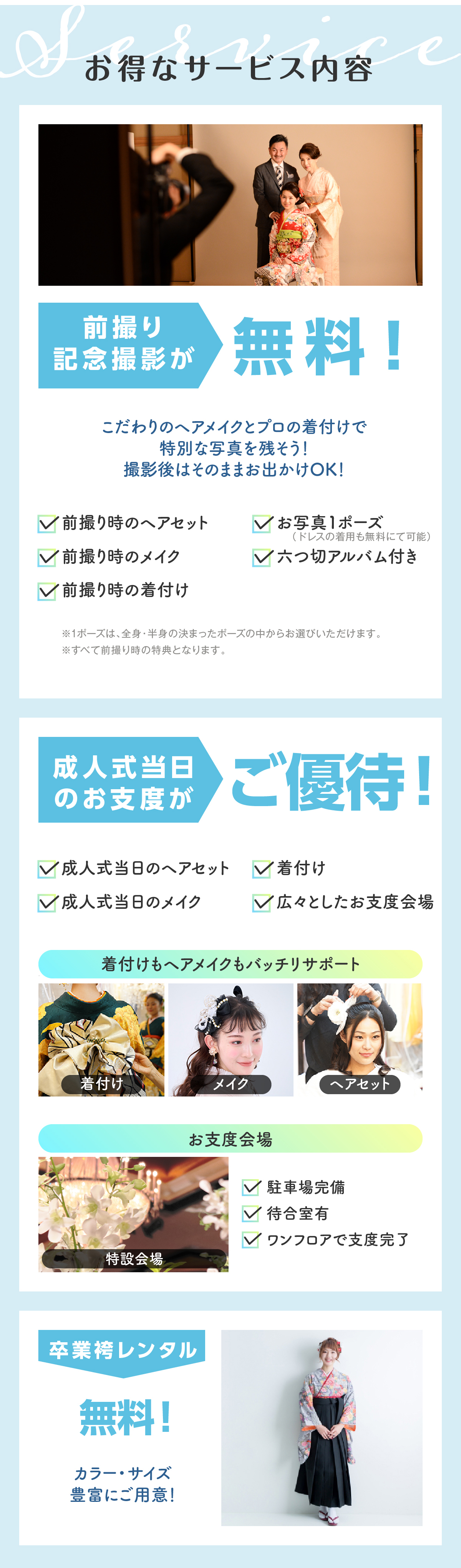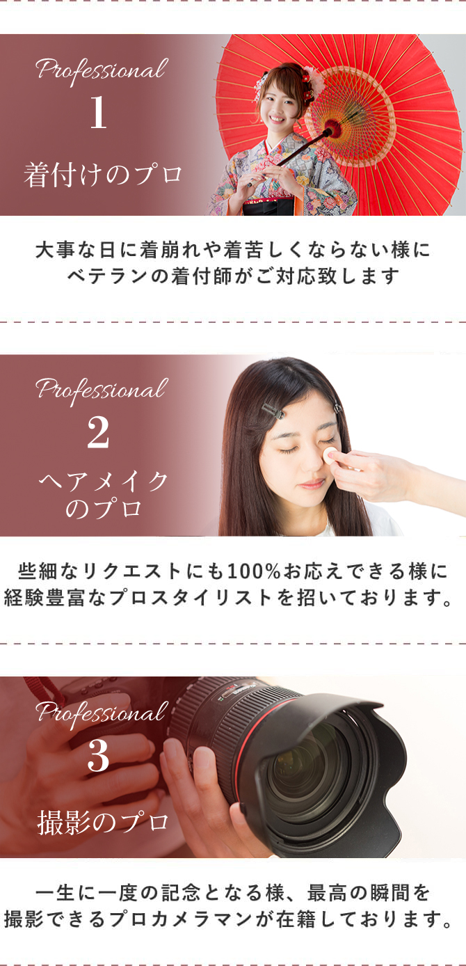 着付けやヘアメイクのサービスがあるか、アフターサービスが充実しているかなど。